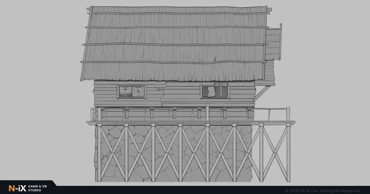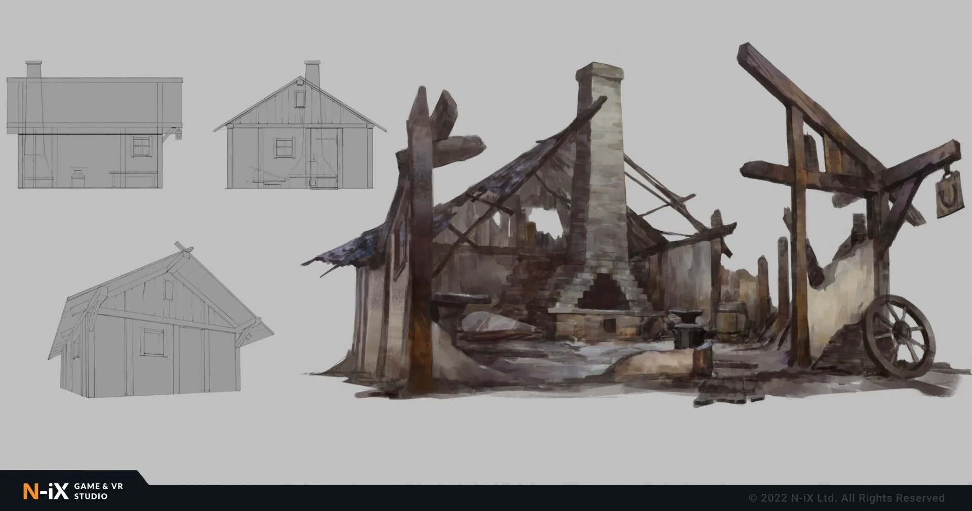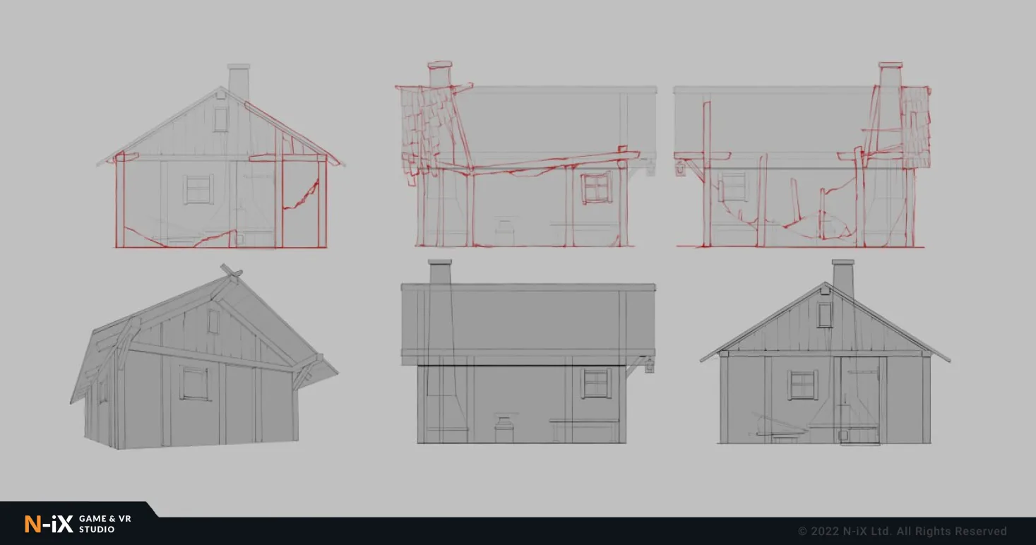 For instance, here we show the final concept, the undamaged house, and the silhouette of the burned-down house model. In this way, the 3D artist will understand the sizes and locations of the burned holes in the building. Sometimes it is also better to point out the materials that the structure is made of in our environment concept design. For our 3D Artists, initially, it was not quite clear whether the roof is made of straw or boards: