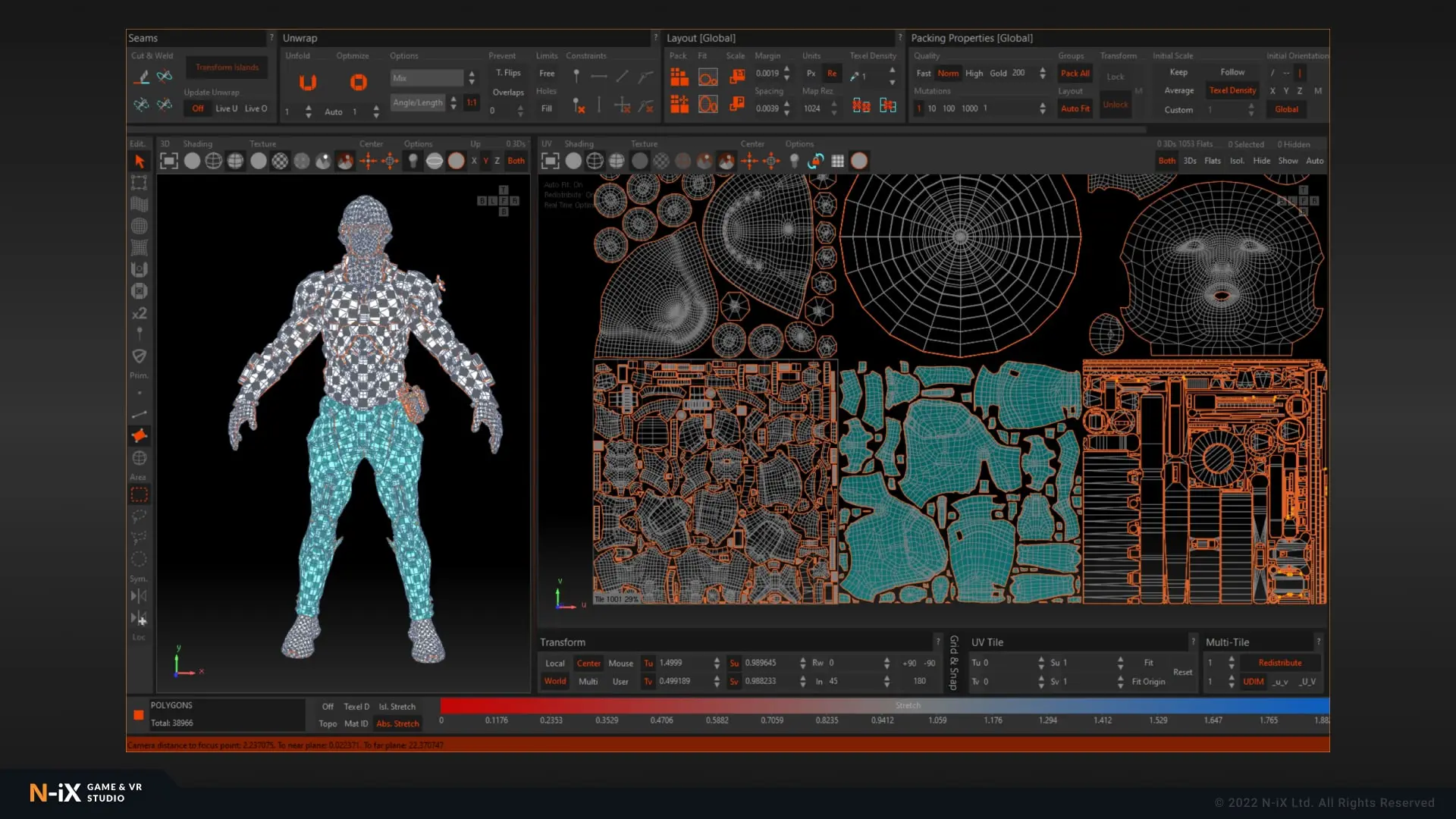 When unwrapping a game character model, try to hide all the stitches in less visible parts of the model. For instance, in armpits, the inner side of a hand, etc. If a certain part of your character’s model needs to be more detailed than others, you can give it more stape when doing UV unwrap.