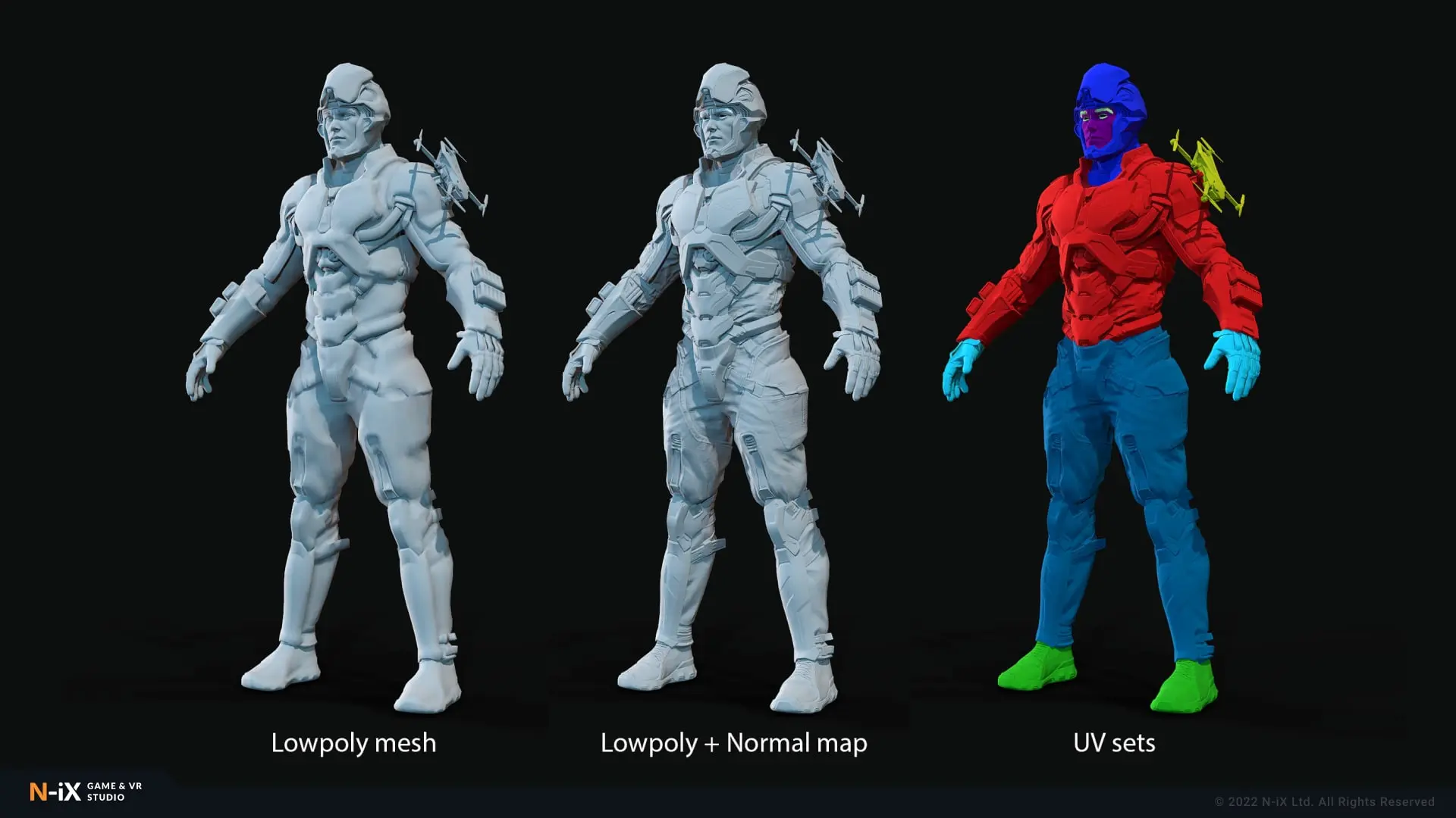 In this way, we will get a low-poly model that looks almost identical to the high-poly model, but it will be light enough for animation and use in the game engine.