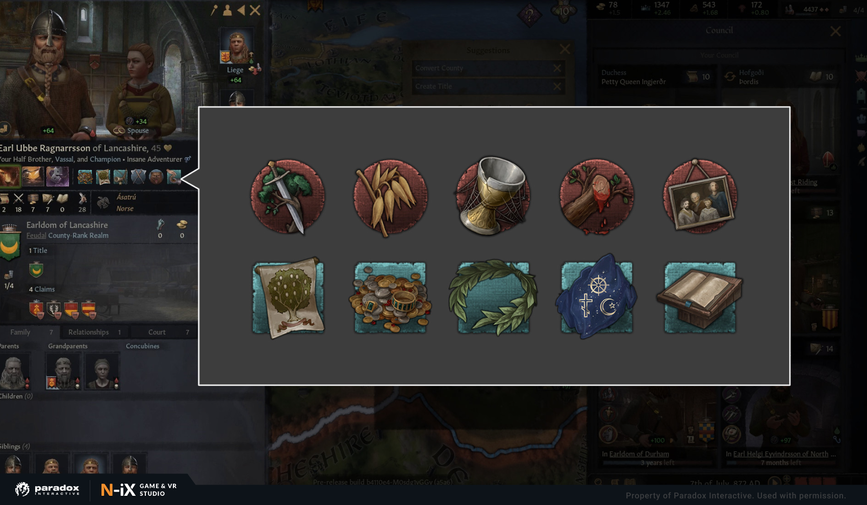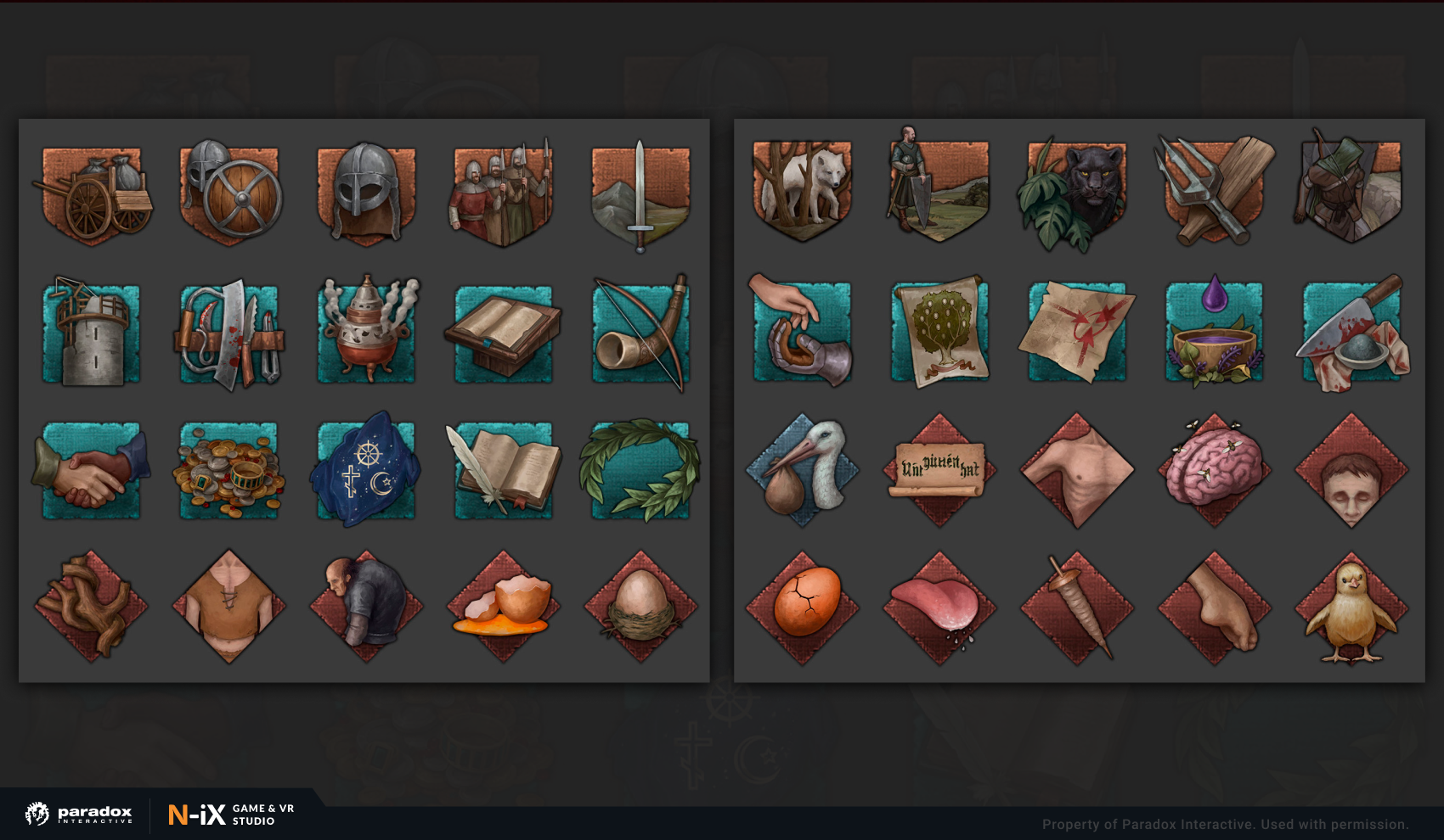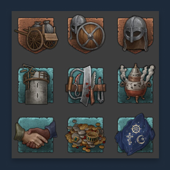 Each trait has a unique icon that gives a visual hint to its meaning. Our task was to produce a set of traits icons following both Paradox Development Studio’s art style and the historical reference. Anything depicted should have existed in the 12th century, including clothes, architecture, armor, items, etc.
