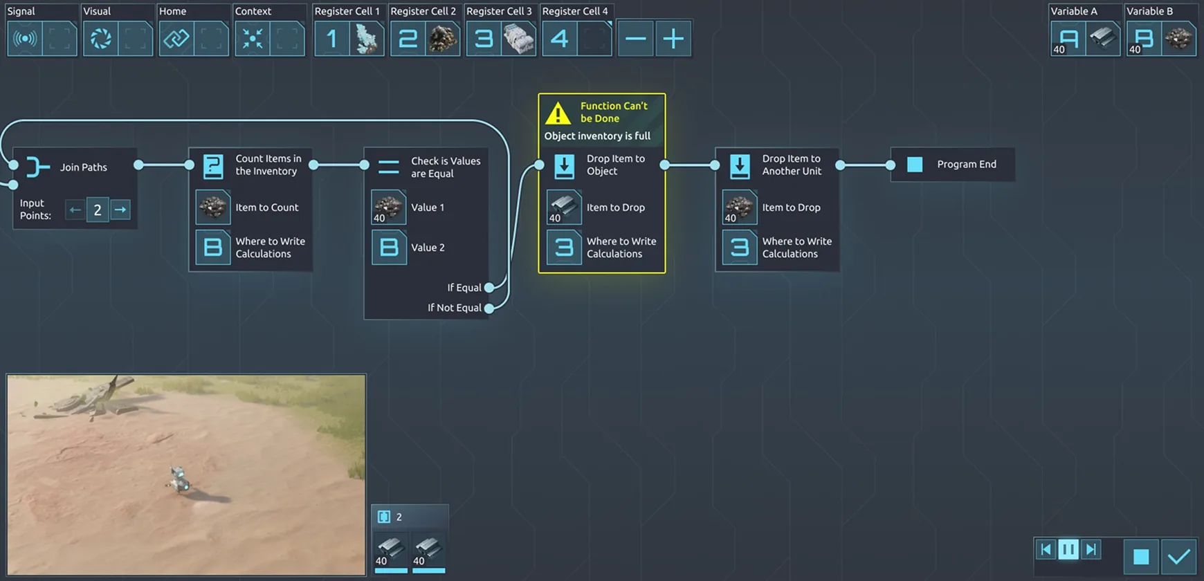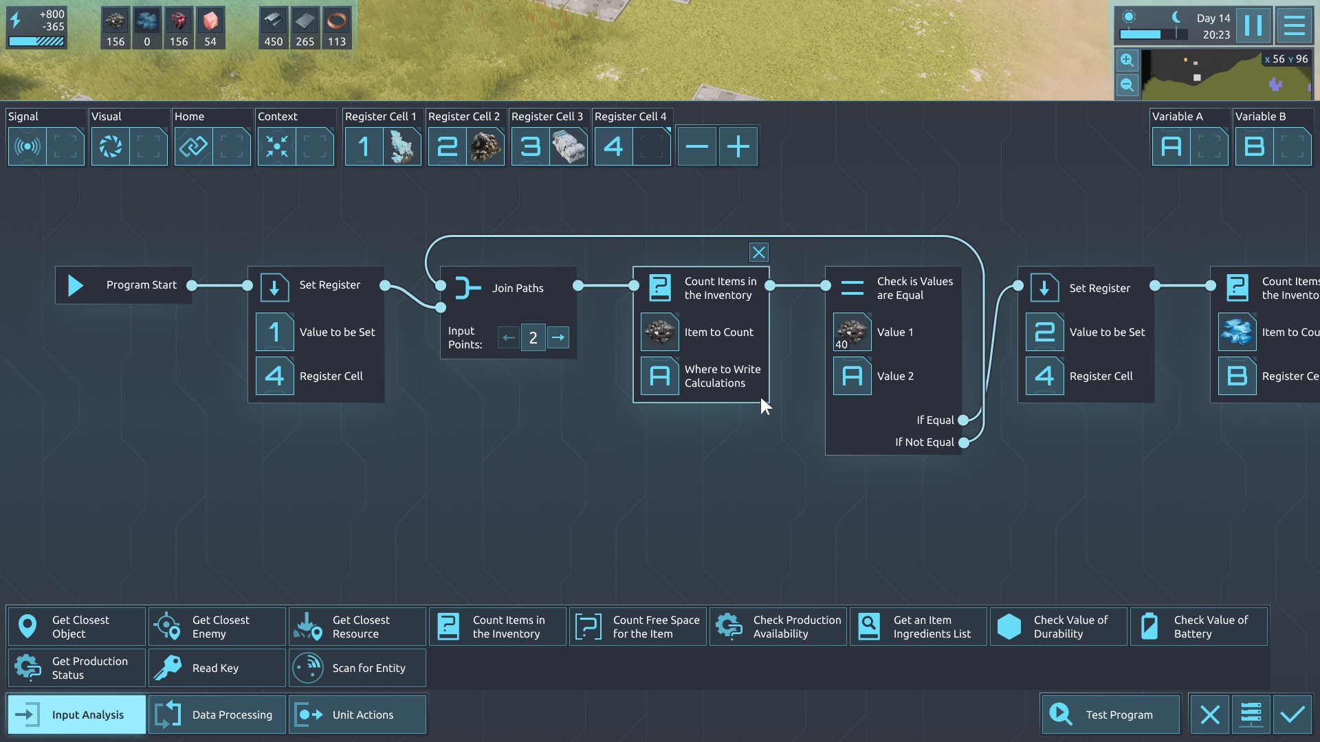 In order to succeed, players have to quickly and effectively automate various game processes. Here, everything depends not only on the creativity and skills of the player but also on a thought-out UI logic. For the visual representation of such a complex system, we decided to use visual programming similar to node graph architecture in Unreal Engine. Thus, as simple as drag-and-drop, players can connect different entities into one system, improve their templates, debug with the help of visual hints, and much more.