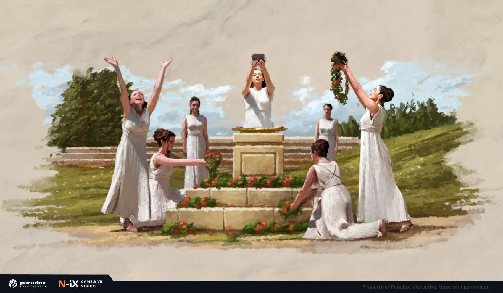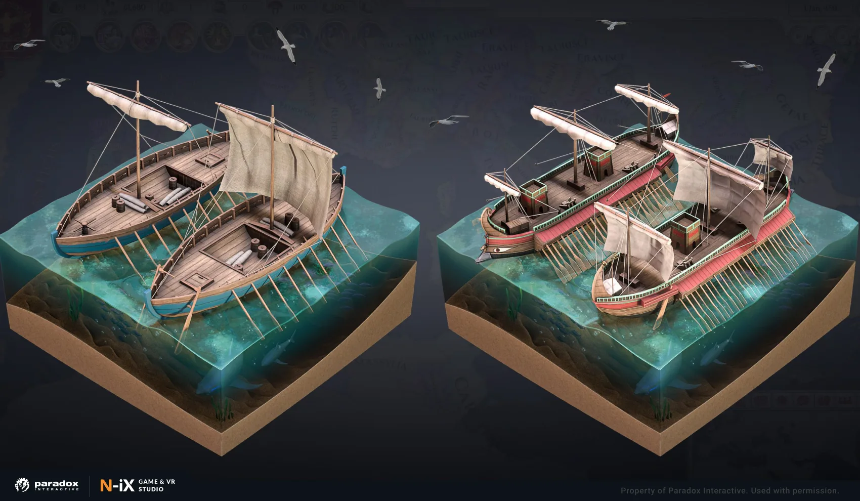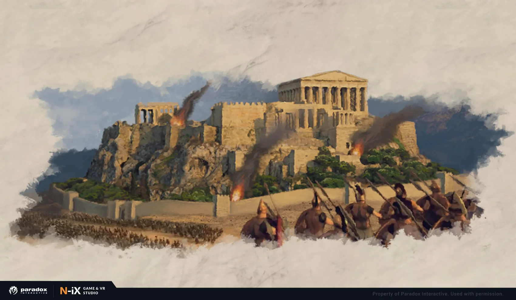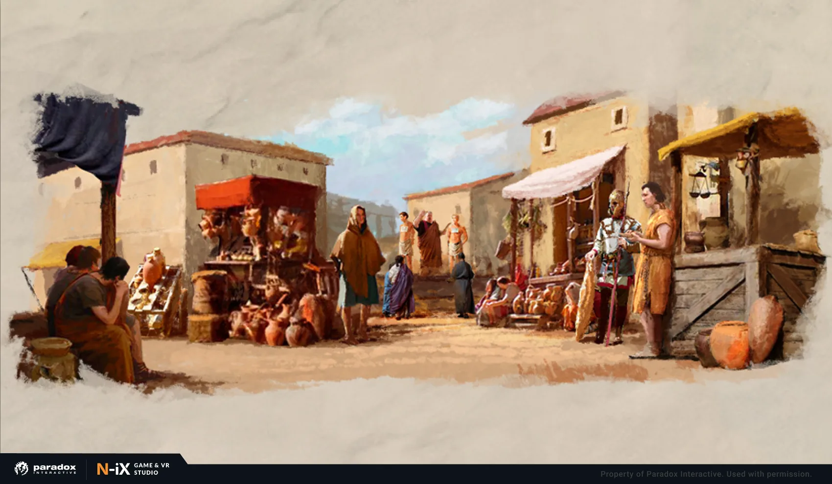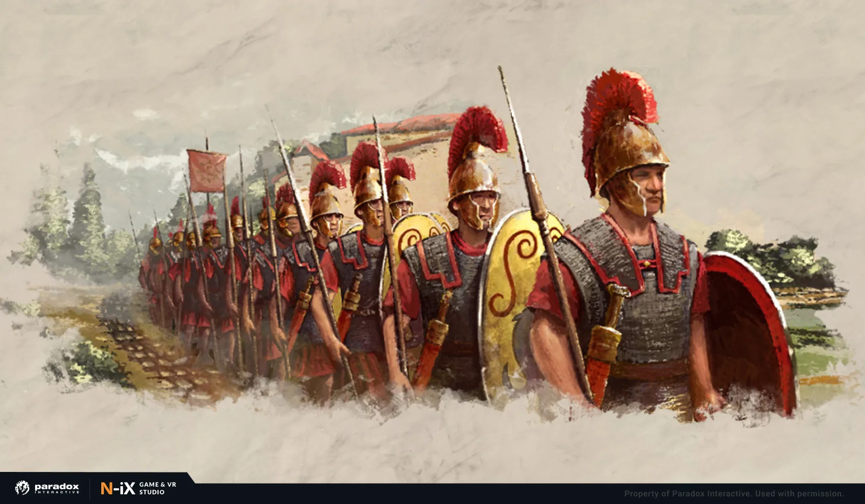 Art Production. Paradox Interactive required N-iX Games to perform many artworks to illustrate in-game events and military traditions of different cultures, represented in the game. The key feature was to copy the antique style with its low contrast and a limited array of colors, to make them look like murals on marble.