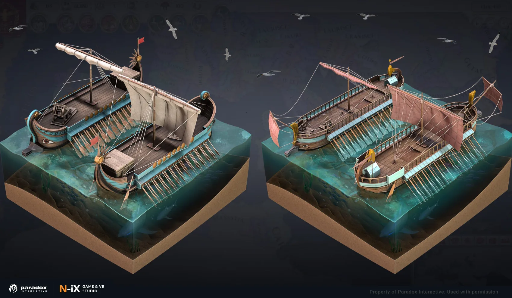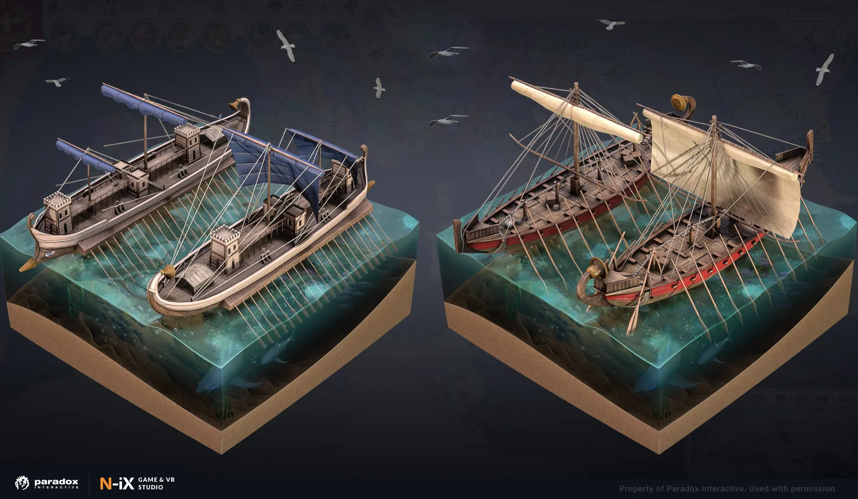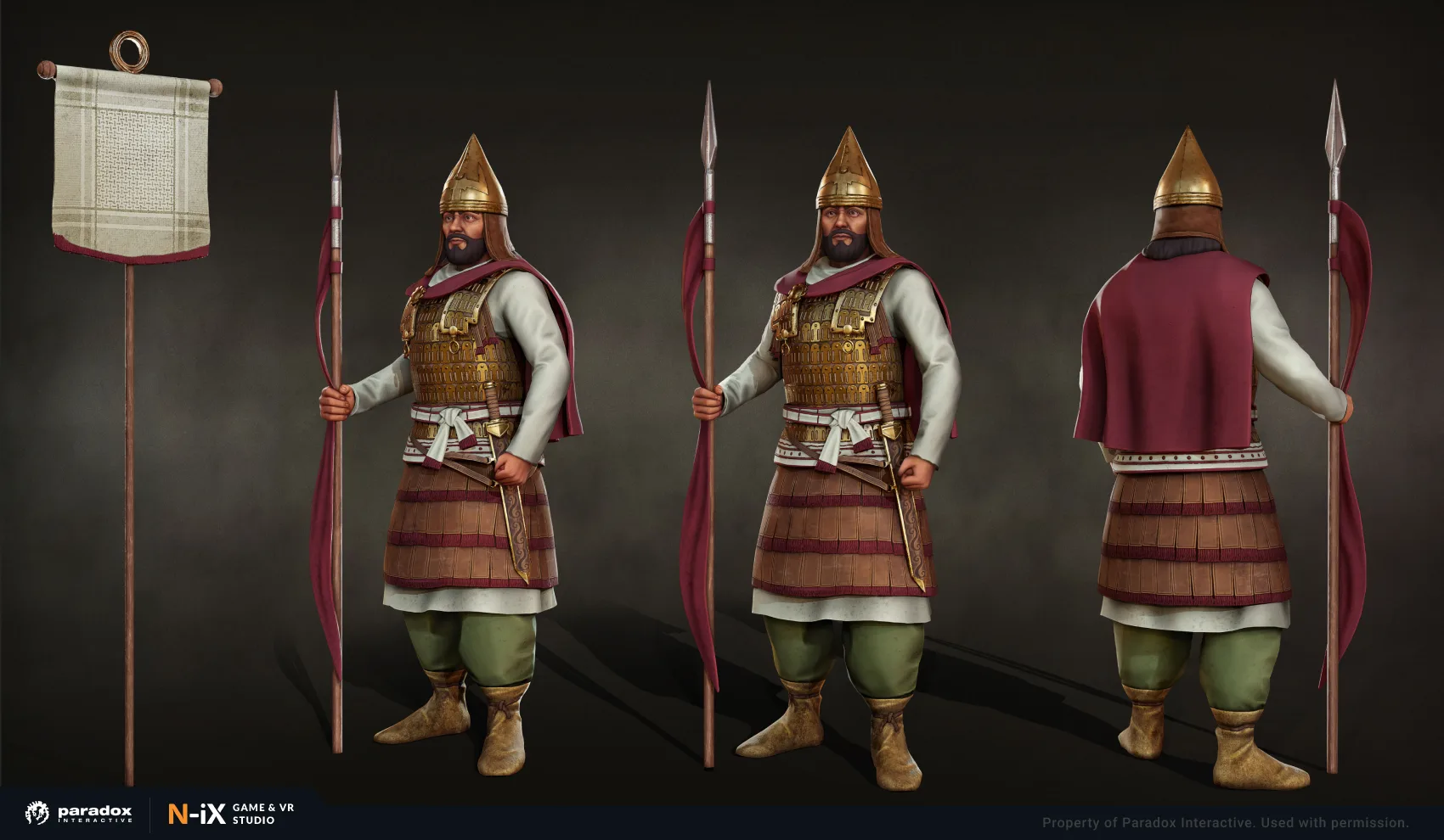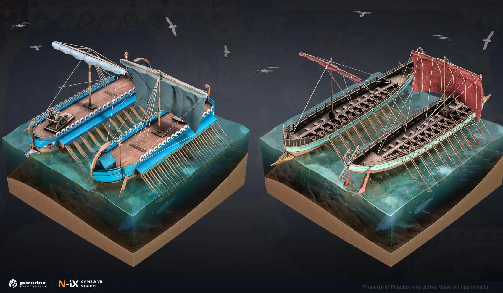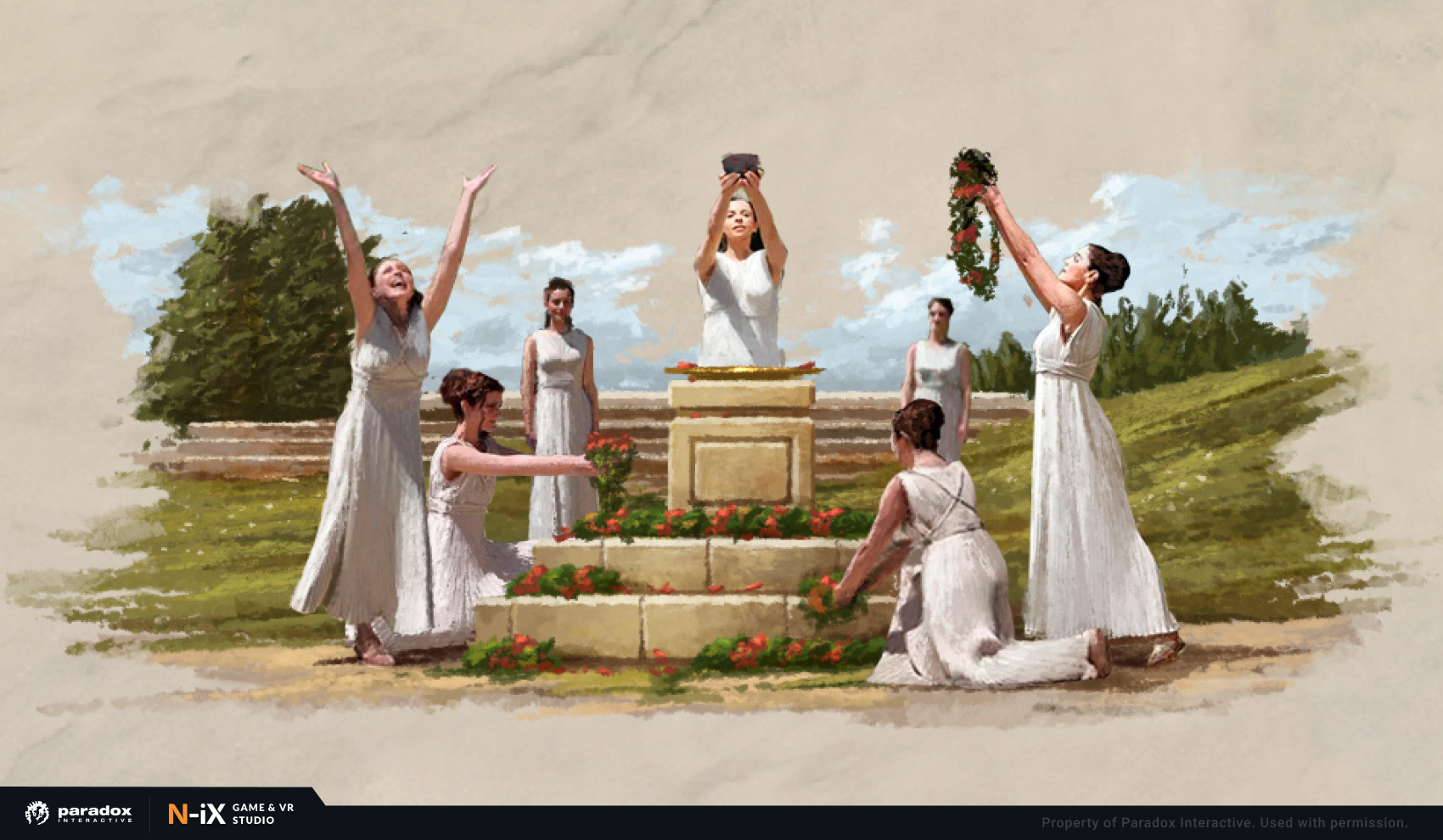 Art Production. Paradox Interactive required N-iX Games to perform many artworks to illustrate in-game events and military traditions of different cultures, represented in the game. The key feature was to copy the antique style with its low contrast and a limited array of colors, to make them look like murals on marble.