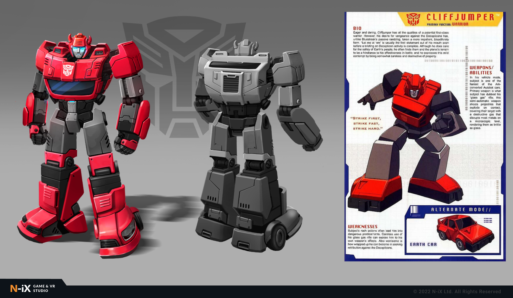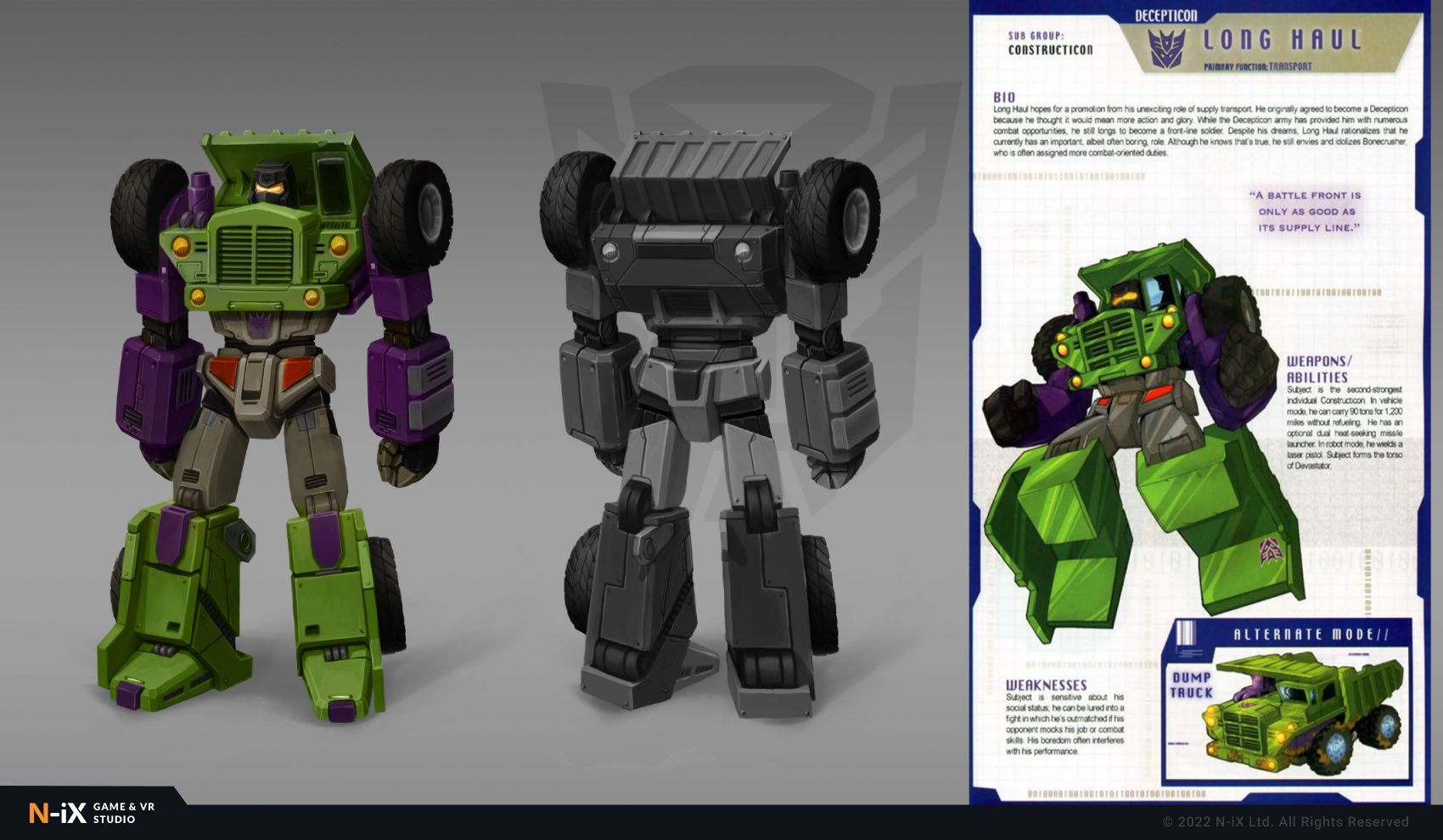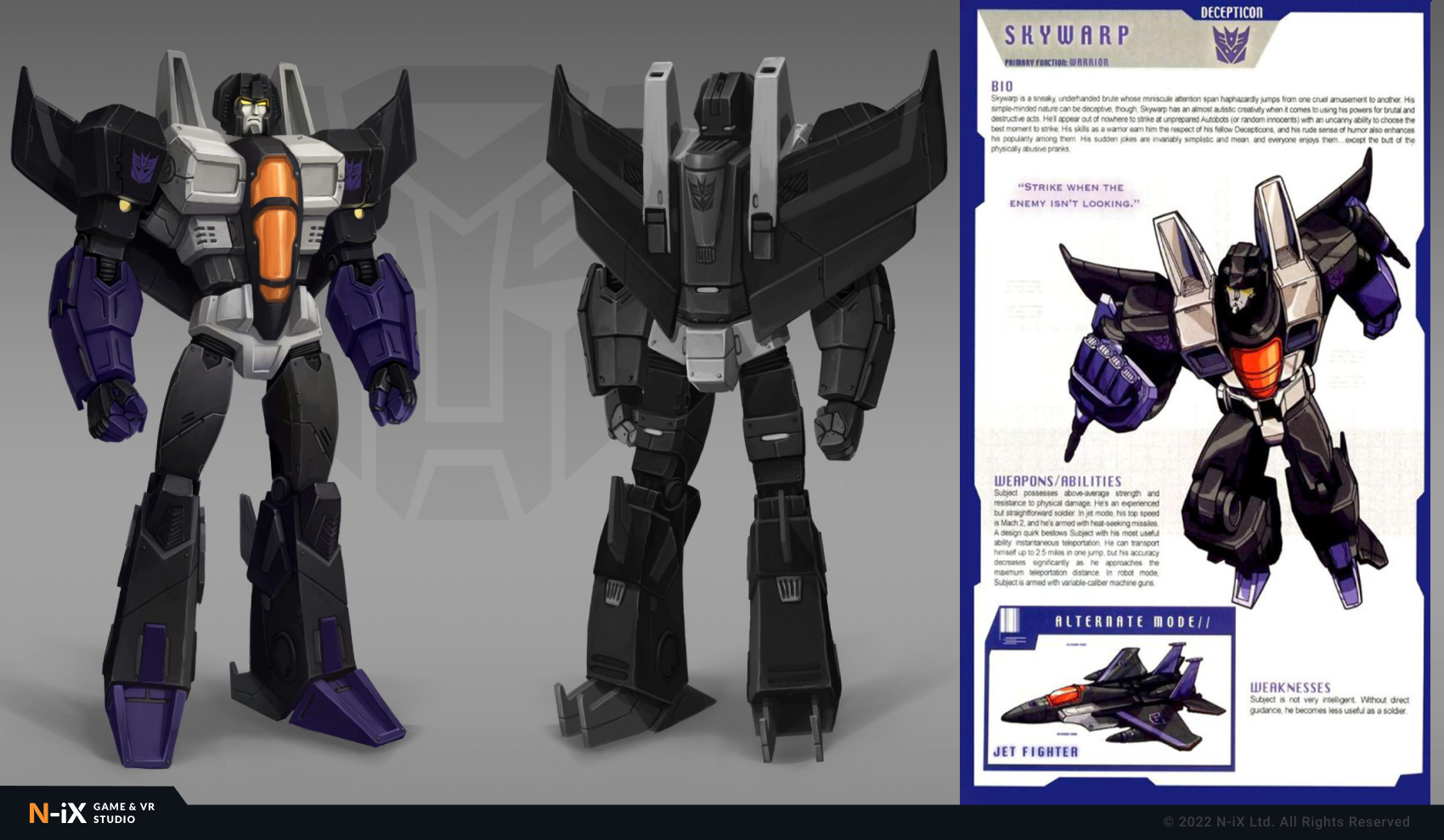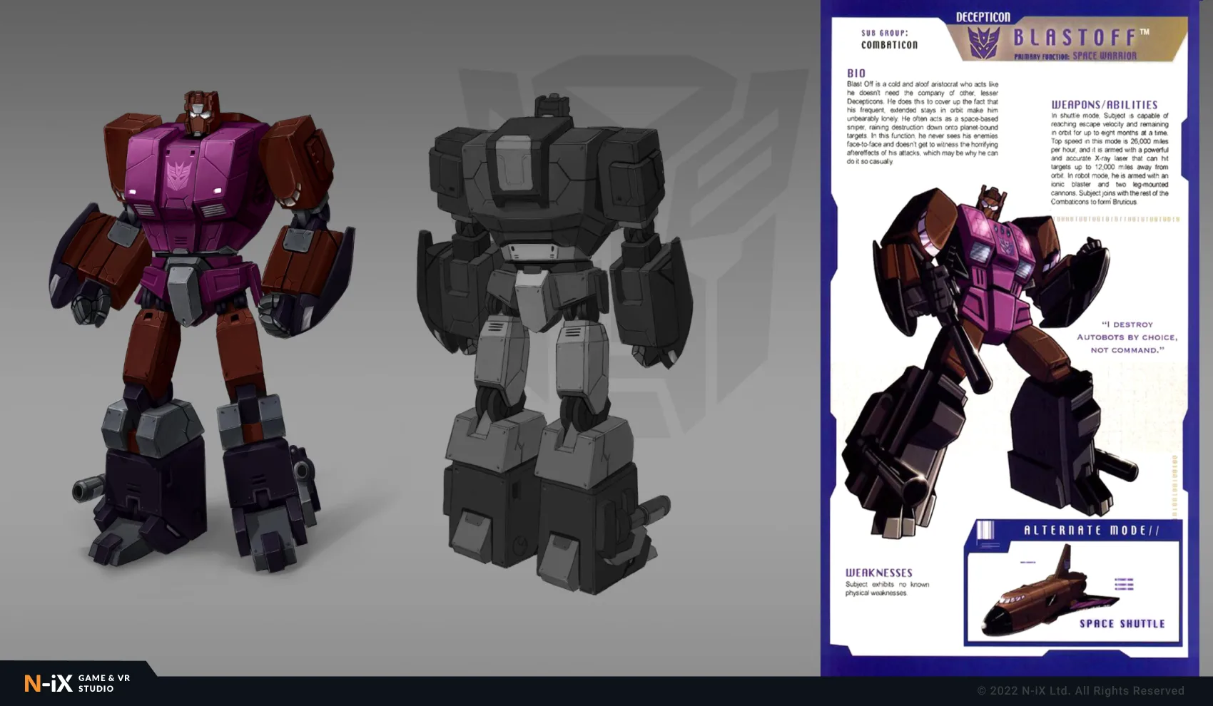 The Client asked N-iX Games to design, model and animate characters for their game, leaning on classic and recognisable design but with a modern flavour, to make “old” transformers more eye-appealing to a younger audience.