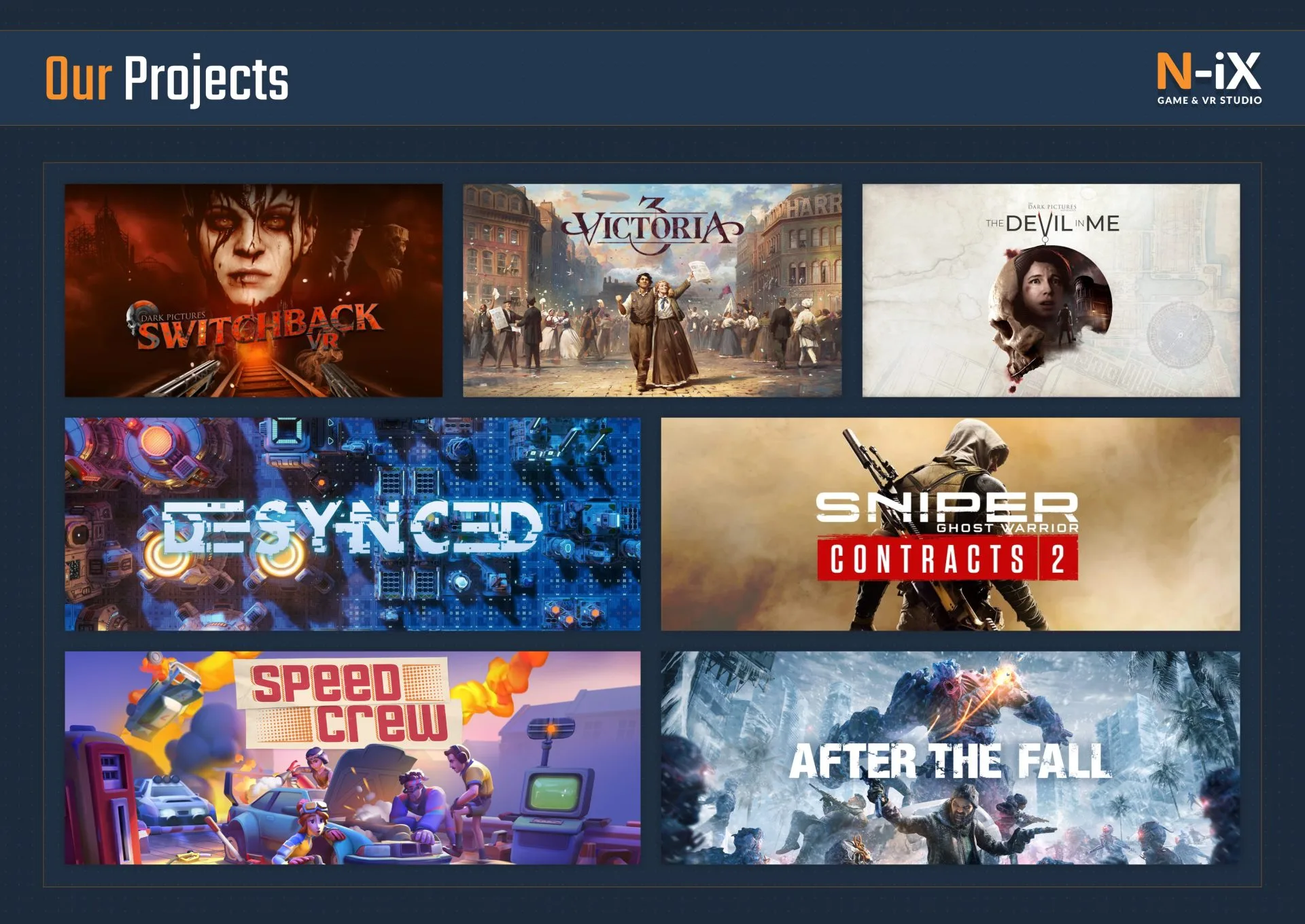 Supermassive Games, known for their captivating narrative and hyper-realistic video games, is a developer behind The Dark Pictures Anthology series. Since 2021, N-iX Game & VR Studio has solidified its role as a crucial technological partner for Supermassive Games. Our skilled engineers actively contributed their expertise to shape recent Supermassive Games’ titles like House of Ashes, The Devil In Me, and The Dark Pictures: Switchback VR. Drawing on our profound knowledge of the VR industry and extensive experience in Unreal Engine programming, art production, and game design, our team has played a significant role in bringing these immersive games to life.
