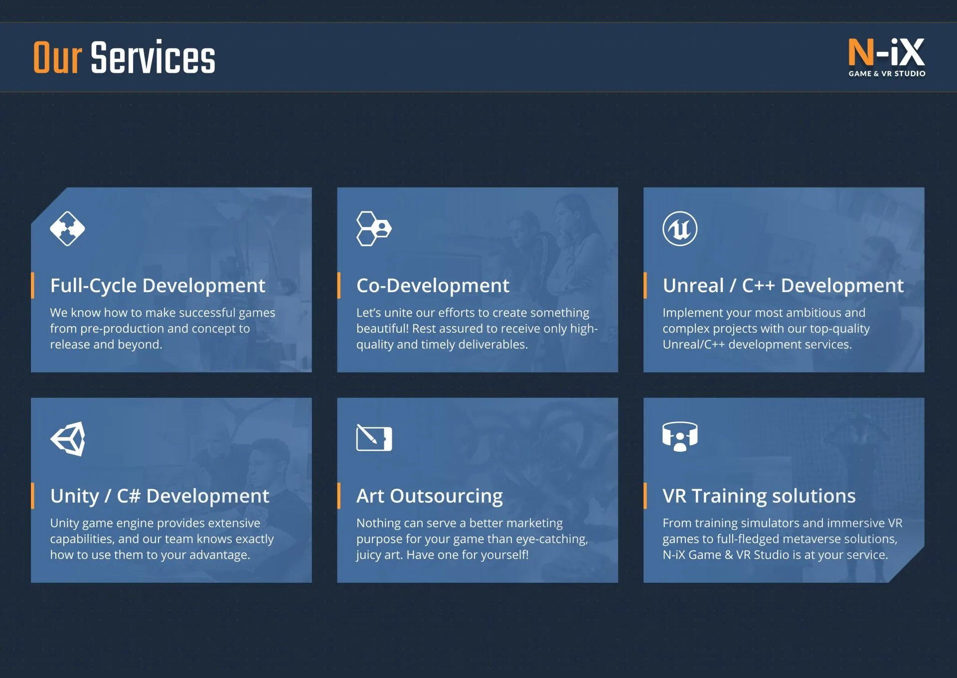 N-iX Game and VR Studio stands as a vital component within a larger organization boasting 2,200 software engineers, a 21-year market presence, and a distinguished employer brand. Our studio is your one-stop destination for a comprehensive range of game development outsourcing services, offering expertise in full-cycle and co-development, Unreal Engine, art production, VR game development, and more. We take pride in the long-term commitment to our customer’s projects and the success stories we make along the way: