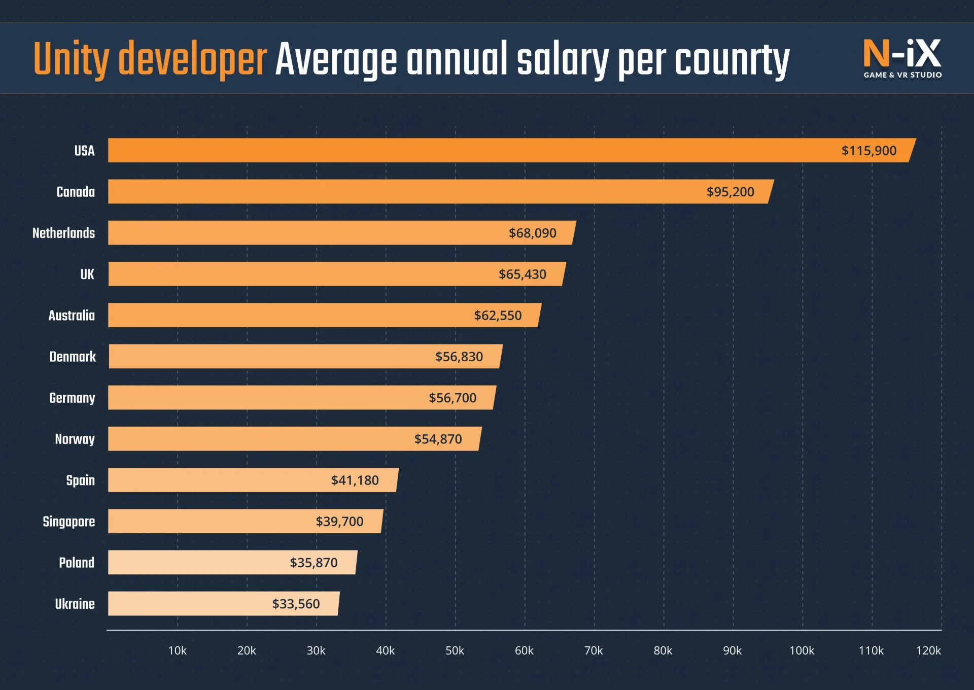 Moreover, the geographical location of your outsourcing hub can be a game-changer when you’re plotting out your budget. Salaries can fluctuate dramatically from country to country, and being in the know about these variations can be your financial ace in the hole. Here’s, for example, the average annual salary of Unity developers across different popular outsourcing destinations: